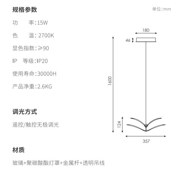 如翼吊灯用双层弯曲的造型作为主要造型特征形成在空间里自由灵动的造型,,以一定的角度倾斜,,形成丰富的画面,,,,两翼的线条均为精心设计,,精准控制光线的传播,,,将直下光和漫反射光结合,,,,70%灯光向下,,,,30%灯光向上,,,在空间里形成舒适的光学效果,,,,下灯罩为片状玻璃印刷专门调制的乳白色油墨,,,热弯成对应弧度,,,,灯光透过灯罩呈现出更加柔和的视觉效果;边缘特意留有5mm宽度透明环,,使视觉更精致轻巧;灯罩利用两个金属“领夹”式的杆连接固定,,,整体视觉优雅;