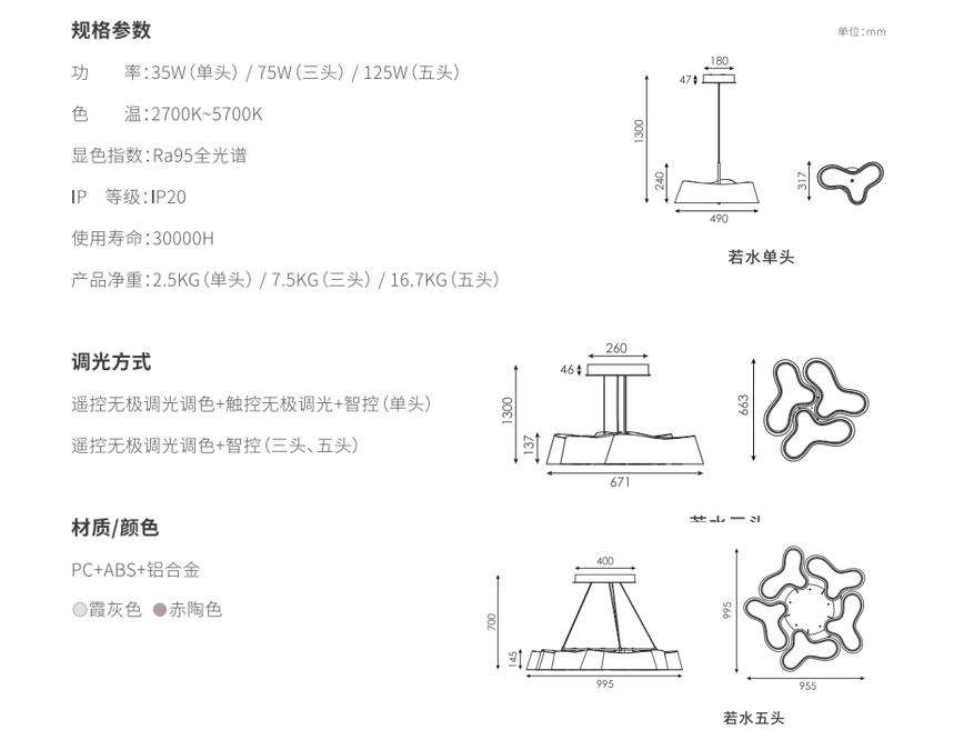 若水吊灯源于中国古典意境中的山水,,,外形如山的曲线婀娜蜿蜒,,其内侧光晕水波纹,,,缓缓晕开;巧妙地将曼妙光影融于山水意境,,,,如空间中悬浮的自然景观,,,专门设计调试的水波纹棱面扩散罩可以起到一定的视觉防眩作用,,,,把原本进入到人眼的杂散光折射掉,,,同时可以提升产品的精致品质感;空间光的强功能性和强装饰性通常是个矛盾点,,但是若水则取得了一个平衡,,,,保证较强光学输出的同时可以有其装饰表现